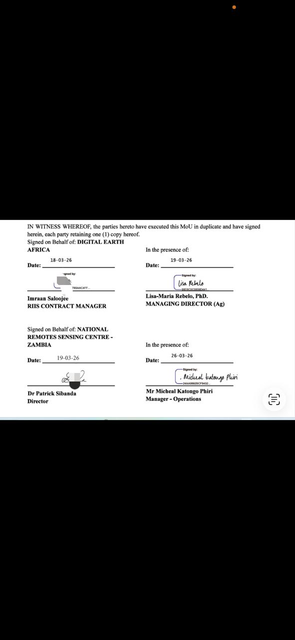 The National Remote Sensing Centre (NRSC) has signed a Memorandum of Understanding (MoU) with Digital Earth Africa (DE Africa), formalising a strategic partnership aimed at advancing the use of Earth observation (EO) data and technologies in Zambia.